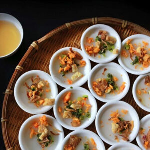 Un peu semblable au Banh cuon Hanoi que vous trouverez dans votre Découverte du Nord du Vietnam mais sa farce est plus diverse avec la crevette et le porc mariné cuit sur le charbon. Notamment, on le sert avec de l’huile et des oignons frits parfumés. On aimerait souvent en manger avec le Cha lua, un plat traditionnel vietnamien.