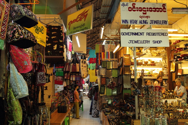 Le marché de Bogyoke Aung San est un grand bazar et marché dans le centre-ville de Yangon. Construit par les Britanniques en 1926, il est connu pour son architecture coloniale et ses ruelles intérieures pavées.