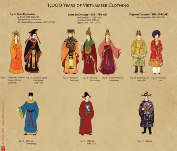 1744 : Le Lord Nguyen Phuc Khoat (alias Vo Vuong) de la dynastie des Nguyen décida de la forme du costume national afin de marquer son affirmation vis-à-vis son voisin du nord. Il existait alors une version pour homme et une version pour femme. Le port du pantalon était obligatoire tant pour les hommes que pour les femmes.