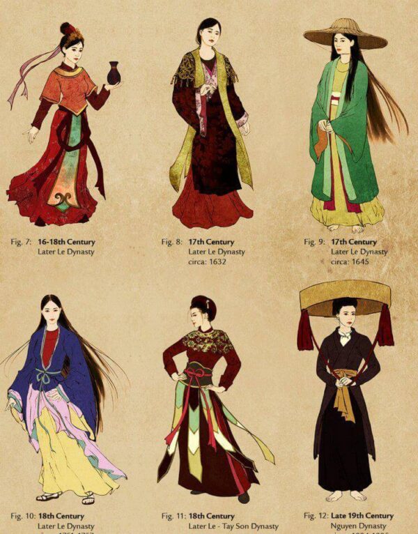 Du 16è au 18è siècle : Les premières versions de la tenue traditionnelle vietnamienne, influencées par la mode de la cour impériale de la Chine, remonteraient au début du 16è siècle.