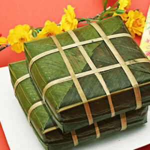 Le gâteau de riz gluant est un gâteau traditionnel, souvent carré (ou cylindrique dans le Sud du Vietnam), préparé à la veille du Tet. Sa recette de base comprend quatre ingrédients principaux : les feuilles “dong,” du riz gluant, des haricots mungo et de la poitrine de porc. Cependant, les variations régionales et les secrets de famille font de chaque Banh Chung une création unique. Certains prennent une forme cylindrique, symbole de fécondité, tandis que d’autres incorporent des arômes de pandanus, de poivre, ou du jus de coco, en particulier dans le Sud du Vietnam.