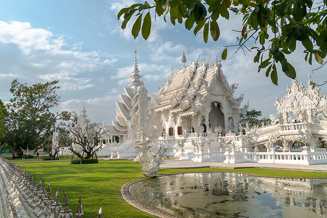 Dans le nord de la Thaïlande, à Chiang Raï, vous pourrez visiter le Wat Rong Khun, plus connu sous le nom de temple blanc. Outre sa couleur, ses sculptures et ses fresques dénotent dans le paysage des édifices religieux. En rupture avec la plupart des autres temples, celui-ci est d’une blancheur extraordinaire, pour symboliser la pureté du bouddhisme, et incrusté de morceaux de miroir pour suggérer la réflexion de l’illumination. Pour y accéder, le visiteur doit d’abord passer entre deux crocs géants, puis devant un lac parsemé de créatures des enfers.