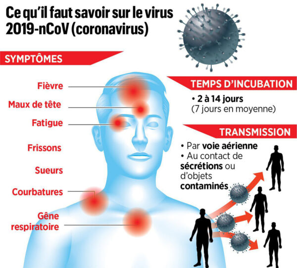 Les symptômes les plus courants de la COVID-19 sont la fièvre, la fatigue et une toux sèche. Certains patients présentent des douleurs, une congestion nasale, un écoulement nasal, des maux de gorge ou une diarrhée. Ces symptômes sont généralement bénins et apparaissent de manière progressive. Certaines personnes, bien qu’infectées, ne présentent aucun symptôme et se sentent bien. La plupart (environ 80 %) des personnes guérissent sans avoir besoin de traitement particulier. Environ une personne sur six contractant la maladie présente des symptômes plus graves, notamment une dyspnée. Les personnes âgées et celles qui ont d’autres problèmes de santé (hypertension artérielle, problèmes cardiaques ou diabète) ont plus de risques de présenter des symptômes graves. Toute personne qui a de la fièvre, qui tousse et qui a des difficultés à respirer doit consulter un médecin. Le CDC estime à l’heure actuelle que les symptômes du nCoV 2019 peuvent apparaître en aussi peu que 2 jours ou aussi longtemps que 14 jours après l’exposition. Ceci est basé sur ce qui a été vu précédemment comme la période d’incubation des virus MERS.