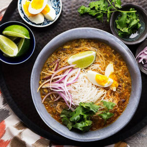 C’est un plan originaire de la région orientale Shan, qui borde la Chine mais il ne se trouvent pas seulement dans l’État Shan. Les nouilles de riz gluantes sont mélangés avec de poulet ou de porc, de purée de tomates, d’oignons et d’épices, puis garnies de légumes aigres ou frais. Ces soupes de nouilles de style shan sont l’un des plats les plus connus du Myanmar.