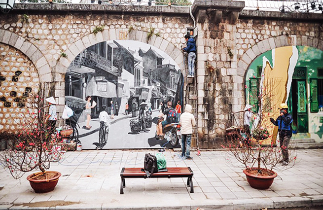 La rue de Phung Hung devient une rue piétonne et tournante reliant la zone du marché de Dong Xuan. Il y a des peintures murales de tous les sujets, y compris les grands magasins généraux, les femmes portant des vendeurs de rue, les trains tintants, les donneurs de cartes, etc. sur des arches rappelant les beaux souvenirs de Hanoï. Il y a 17 œuvres au total parmi 127 arches qui transmettent le message à une capitale civilisée millénaire de Hanoï. La rue murale a attiré de nombreux touristes nationaux et étrangers pour profiter et prendre des photos avec les œuvres d’art ici.
