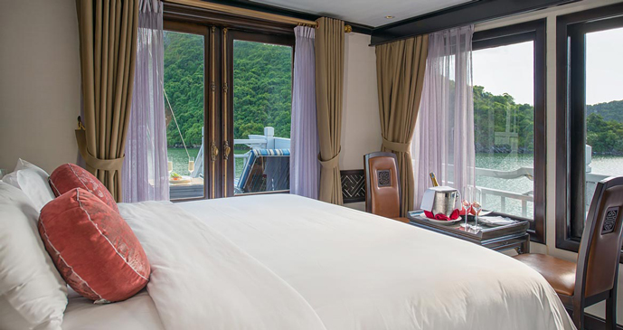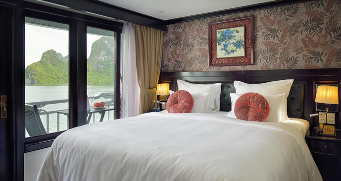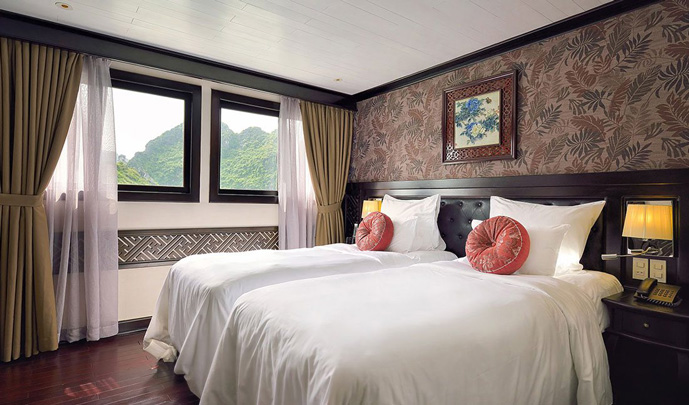 Chacune des quatre Paradise Luxury Cruises abrite 17 cabines de caractère au design classique avec un intérieur en bois confortable mettant en valeur le design traditionnel du navire de croisière en bois junk. En termes de charme et de confort, nos cabines ne laissent rien à désirer, avec des lits moelleux pour un sommeil réparateur, des fenêtres agrandies pour des vues spectaculaires et, dans de nombreux cas, un balcon adjacent offrant votre propre espace privé parmi les magnifiques structures karstiques de Baie d’Halong.