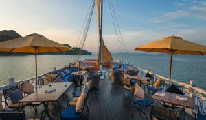 07:00 – 08:00: Prenez un petit déjeuner léger avec café, pâtisseries et contemplez l’aube dans la baie d’Halong