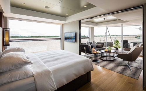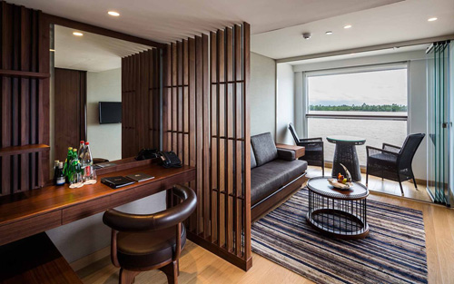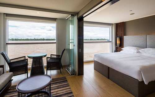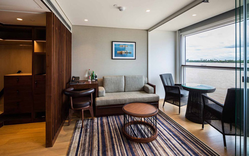 Avec la superficie de 80 mètre carré, c’est la plus grande chambre sur le fleuve Mékong. Étant en avant sur le Pont Diamant, vous pouvez profiter d’une vue magnifique des paysages de votre terrasse privée avec Jacuzzi à l’extérieur et le lit de jour. Toutes les suites disposent d’un salon séparé et la salle à manger, la zone dressing et une grande salle de bains luxueuse qui vous apportent une baignoire séparée, la toilette et la douche.